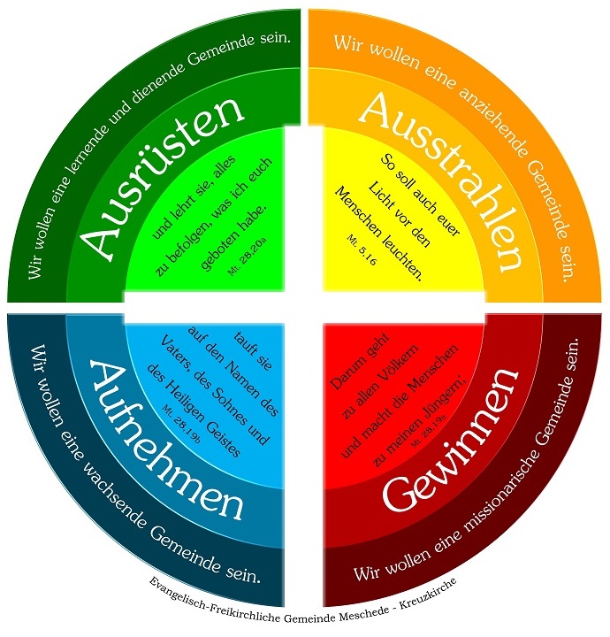 Wir wollen Kinder, Jugendliche und suchende Menschen, Freunde und Gäste mit dem Evangelium in Wort und Tat bekannt machen und sie für ein Leben in der Nachfolge Jesu ermutigen und gewinnen.